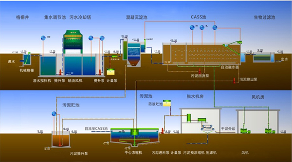 工艺流程短,占地面积少:污水厂主要构筑物为集水池、沉砂池、CASS曝气池、污泥池,而没有初次沉淀池、二次沉淀池,布局紧凑,占地面积可减少20%~35%;