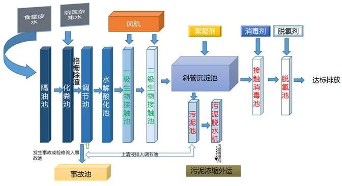 根据本项目医院污水污染物指标参数,该污水处理站采用调节+水解酸化+一级生物接触氧化+二级级生物接触氧化+ 斜管沉淀+消毒+脱氯工艺对污水进行处理。消毒采用次氯酸钠进行消毒,污泥经叠螺污泥脱水机脱水后委托有危废处 理资质的单位进行外运无害化处理。